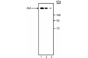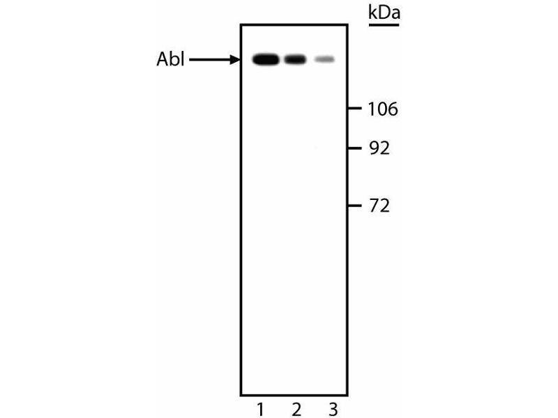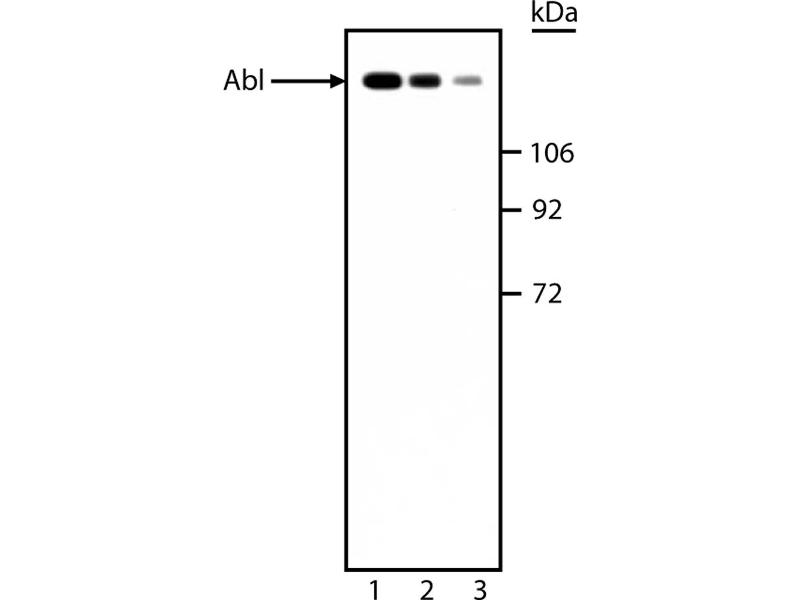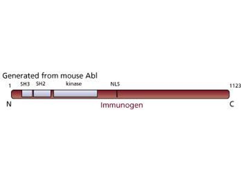 - The proto-oncogene c-abl was first isolated from the mouse genome as a gene with similarity to the v-abl oncogene of Abelson murine leukemia virus. The c-abl gene encodes a protein tyrosine kinase that is localized in the cytoplasm and nucleus. The c-abl protein shares several common features with other cytoplasmic tyrosine kinases, including the src-homology domains 2 (SH2) and 3 (SH3). The SH2 domain is believed to bind specifically to tyrosine residues of other proteins. The function of the SH3 domain is still unclear. Unique to the c-abl tyrosine kinase is a large C-terminal segment which seems to be essential for its biological function, since mice homozygous for a C-terminal deletion of c-abl have multiple defects at birth. The C-terminal fragment of c-abl contains a DNA-binding domain, and the DNA-binding affinity of this domain seems to be regulated by phosphorylation of critical serine/threonine residues. The c-abl proto-oncogene can be activated in a variety of ways. For example, in Philadelphia chromosome (Ph1)-positive leukemias the c-abl proto-oncogene on chromosome 9 becomes fused to the bcr gene on chromosome 22, and bcr-abl fusion proteins are produced. Ph1-positive cells express either the a-typical 210 kDa bcr-abl fusion protein or a smaller 185 kDa bcr-abl fusion protein. The bcr sequences activate the c-abl tyrosine kinase by deregulating its expression, and actin filament-binding function associated with c-abl is also activated. Expression of bcr-abl fusion proteins in vitro leads to transformation of pre-B lymphoid cells supporting their role as an oncogene. The phosphorylated form of c-abl is observed at ~145 kDa on SDS/PAGE. The 8E9 clone has been reported to react with an epitope in the tyrosine kinase domain of murine abl proteins [Wang et al.]. This antibody is routinely tested by western blot analysis.