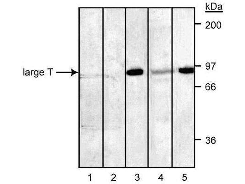 - Simian virus 40 is a small DNA virus encoded by 5.2 kb of double-stranded DNA. SV40 large T antigen (T-ag) is a multifunctional ~85 kD phosphoprotein, which is the sole viral protein required for SV40 replication. All other factors are provided by the infected host cell. In addition to its role in SV40 DNA replication, T-ag also causes transformation of susceptible cell lines. Studies of various mutant T-ag proteins have shown that the replication and transformation fractions of T-ag can be separated. The multifunctional nature of this protein has resulted in its use as a model system in a wide variety of disciplines. SV40 T-ag exercises negative regulation on the transcription of SV40 early mRNA by feedback inhibition and exerts positive regulation on transcription from the late promoter. In addition to transcriptional regulation, T-ag is involved in viral DNA replication. Specific biochemical functions required for DNA synthesis that are inherent to the T-ag include high-affinity binding to sites within the viral origin of DNA synthesis, and ATPase and helicase activities. Other functions attributed to T-ag include cellular transformation, induction of cellular DNA synthesis, induction of rRNA synthesis and provision of a host-range function for viral replication. However, all functions of T-ag are influenced by a wide range of post-translational modifications including phosphorylation, glycosylation, acetylation, acylation and adenylation. T-ag exists in monomeric as well as polymeric forms and associates with the tumor suppressor proteins p53 and Rb (retinoblastoma protein). Most of T-ag is transported to the nucleus, while a small fraction is localized at the cell surface. PAb 101 recognizes a C-terminal epitope within the last 190 amino acids of T-ag. PAb 101 was originally known as Clone 7. Studies have suggested that PAb 101 binds the strongest to mature T-ag. PAb 101 (i.e., Clone 7) was developed along with a panel of monoclonal antibodies where SV40-transformed BALB/c mouse cell lines (SVT2 or B4) were used as immunogens. The specificity of the antibody was originally characterized by a variety of techniques using SV40-infected and SV40-transformed cells.