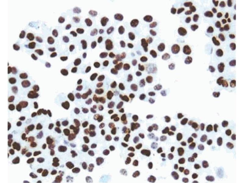 - Simian virus 40 (SV40) is a small DNA virus encoded by 5.2 kb of double-stranded DNA. SV40 large T-antigen (T-ag) is a multifunctional ~85 kDa phosphoprotein, which is the sole viral protein required for SV40 replication. All other factors are provided by the infected host cell. In addition to its role in SV40 DNA replication, T-ag also causes transformation of susceptible cell lines. Studies of various mutant T-ag proteins have shown that the replication and transformation fractions of T-ag can be separated. The multifunctional nature of this protein has resulted in its use as a model system in a wide variety of disciplines. T-ag exercises negative regulation on the transcription of SV40 early mRNA by feedback inhibition and exerts positive regulation on transcription from the late promoter. In addition to transcriptional regulation, T-ag is involved in viral DNA replication. Specific biochemical functions required for DNA synthesis that are inherent to the T-ag include high-affinity binding to sites within the viral origin of DNA synthesis, ATPase, and helicase activities. Other functions attributed to T-ag include cellular transformation, induction of cellular DNA synthesis, induction of rRNA synthesis, and provision of a host-range function for viral replication. However, functions of T-ag are influenced by a wide range of post-translational modifications including phosphorylation, glycosylation, acetylation, acylation, and adenylation. T-ag exists in monomeric as well as polymeric forms, and associates with the tumor suppressor proteins p53 and retinoblastoma protein (Rb). Most of T-ag is transported to the nucleus, while a small fraction is localized at the cell surface. Small t-Ag is a polypeptide which shares 82 N-terminal amino acids with large T antigen and has a unique C-terminal region. Clone PAb 108 recognizes an N-terminal epitope within the first 82 amino acids of T-ag and small t antigen (t-ag). B4 SV40-transformed BALB/c mouse fibroblasts were used as immunogen. PAb 108 was originally produced and characterized as part of a panel of antibodies designated PAb 102-117.