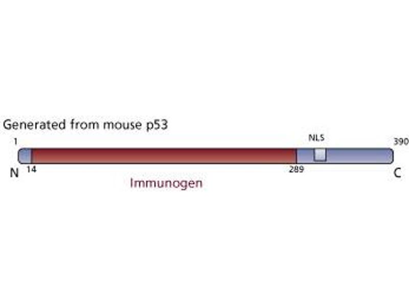 P53 is a nuclear phosphoprotein which acts as a tumor suppressor by providing a cell cycle checkpoint for DNA damage during S-phase. Mutations in wildtype p53 can indirectly alter the DNA binding and transcription factor activity of p53. By altering expression of genes normally regulated by p53, these mutations can result in both a loss of tumor suppressor function and a gain of oncogenic function. The majority of mutations in the p53 gene are missense mutations which alter the identity of an amino acid. These mutations may alter the conformation and thus increase the stability of the mutant p53 protein. p53 is expressed in all vertebrate species examined. p53 may be overexpressed in transformed cell lines, where it forms complexes with viral oncogenes including SV40 large T antigen and the adenovirus protein, E1B. p53 migrates at ~53 kDa on SDS-PAGE. PAb 240 reacts with a conformational epitope between amino acids 156 and 214 of native p53. As such, Pab 240 recognizes only certain mutant forms of p53, as determined by immunoprecipitation. It detects both mutant and wildtype p53 in western blot analysis and immunohistochemistry of frozen tissue sections. It is thought that p53 mutations exert a common conformational change which results in expression of the Pab 240-specific epitope on mutant p53 molecules. A recombinant fusion protein of p53 sequence including amino acids 14-289 was used as immunogen.
