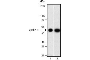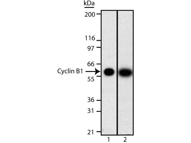 - Cyclins and cyclin-dependent kinases (cdks) are evolutionarily conserved proteins that are essential for cell-cycle control in eukaryotes. Cyclins (regulatory subunits) bind to cdks (catlytic subunits) to form complexes that regulate the progression of the cell cycle. The main cyclin-cdks complexes formed in vertebrate cells are cyclin D-cdk4 (G0/G1), cyclin E-cdk2 (G1/S), cyclin A-cdk2 (S) and cyclin B1-cdk1 (G2/M). These complexes are regulated by activating and inhibitory phosphorylation events, as well as by interactions with small regulatory proteins, such as p21 and p27 [Kip1]. Cyclin B1 is a mitotic cyclin, where expression is normally low in G0/G1, increases in S and is maximal during the G2/M phase. Cyclin B1 is rapidly degraded at the end of mitosis, and is required for cells to exit from mitosis. This antibody has been reported to react to hamster and mouse cyclin B1. In addition, the GNS-1 antibody has been reported to recognize an epitope between amino acids 1-21 of human cyclin B1.