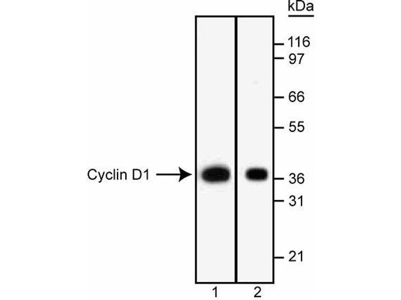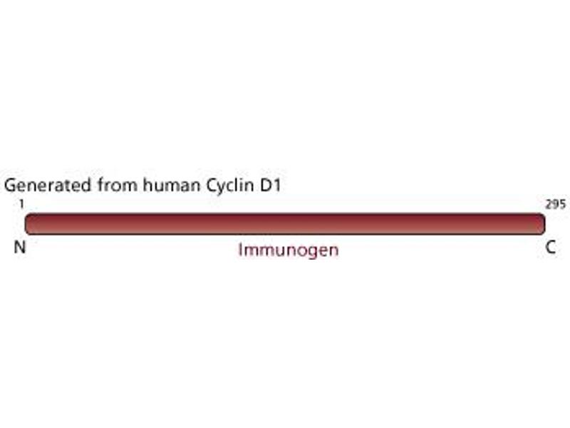 - Cyclins and cyclin-dependent kinases (cdks) are evolutionarily conserved proteins that are essential for cell-cycle control in eukaryotes. Cyclins contain a conserved amino acid sequence motif, the cyclin box, which allows their binding to cdks to form active complexes that regulate the progression of the cell cycle. The synthesis and degradation of cyclins is tightly controlled in a cell cycle specific manner. Several classes of cyclins (A-E) have been described. Cyclins have been placed into functional groups as follows: Group 1 (cyclins A, B, D1, D2, D3, E and F) functions primarily in cell cycle reguation, Group 2 (cyclins C and H) also plays a role in transcriptional regulation, Group 3 (cyclins G1, G2 and I) may play a role distinct from other cyclins. Specific substrates for cyclin-cdk complexes include nuclear lamins, histones, oncogenes (c-src, c-abl, SV40 large-T Ag), tumor suppressor genes (Rb and p53), and others. The D-type cyclins are involved in regulating the passage of mammalian cells through G1. The reduced molecular weights of cyclin D1 is ~36 kD. G124-326 recognizes human cyclin D1 and cross-reacts with the mouse homolog (Cyl1) of human cyclin D1. It does not cross-react with human cyclins D2 and D3. Recombinant full-length human cyclin D1 was used as immunogen. The antibody was originally evaluated by ELISA, western blot analysis and immunohistochemistry of frozen and paraffin-embedded tissue sections.