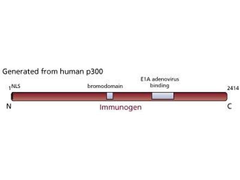 Many serotypes of human adenoviruses (Ad) are able to transform rodent cells in culture because of functions encoded by early region adenovirus 1A (E1A) and 1B (E1B) genes. These virus early gene products bind to specific cellular proteins that normally act to restrict cell growth. The E1A gene, essential for viral replication, encodes protein products with three amino acid regions (1, 2 and 3) conserved among all known adenovirus serotypes. Regions 1 and 2 and the relatively unconserved amino terminus (N) are E1A sequences required for cell growth-regulating functions. The region 2 site binds the retinoblastoma (Rb) and Rb related proteins, p107 and p130. The amino terminal site binds p300, a large cellular DNA binding protein. p300 is a relatively stable, ubiquitously expressed, nuclear phosphoprotein which is conserved among a variety of mammalian species. It is actively synthesized and phosphorylated in both quiescent and proliferating cells. A phosphatase sensitive form with decreased mobility has been identified in M-phase enriched cell populations. Evidence suggests that p300 plays a role in cellular transcription mechanisms. It has sequence-specific DNA binding activity with a consensus DNA binding sequence similar to enhancer elements targeted by the E1A repressor function. The presence of p300 and p300-associated proteins in complexes with the TATA binding protein suggests that p300 has specific interactions with basal transcription mechanisms. Through its association with the TATA regions, p300 may also play a role in the ability of E1A to activate the hsp70 promoter dependent on specific TATA box sequences. p300 migrates at a reduced molecular weight at ~300 kD. Clone NM11 recognizes human p300 a cellular E1A binding protein p300. Specifically, it has been shown to recognize p300 from human, monkey, mouse and rat cell lysates. NM11 will also coprecipitate E1A in association with p300 when E1A is present. Affinity purified p300 was used as immunogen. p300 was affinity purified from 293 human kidney cells (adenovirus type 5 [Ad5] transformed cell line) by co-immunoprecipitation using an E1A-specific monoclonal antibody (M73), which was covalently linked to protein A-Sepharose beads.