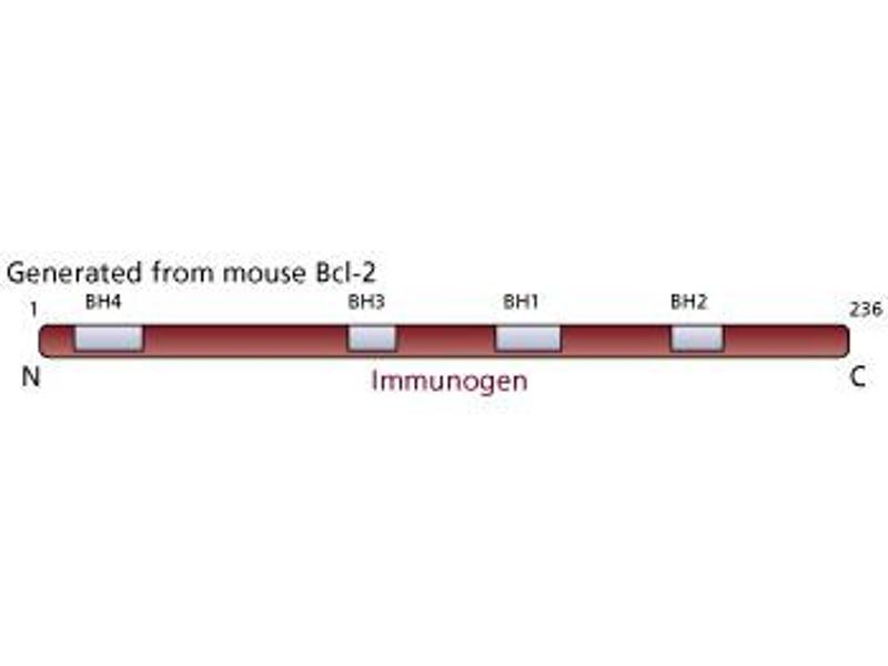 - Bcl-2 is considered to be novel among proto-oncogenes because it blocks apoptosis (programmed cell death) in many cell types. Apoptosis is an active form of cellular suicide that typically requires new RNA and protein synthesis and is associated with distinct morphological changes including cell shrinkage, cytoplasm membrane blebbing, nuclear fragmentation and DNA degradation. The Bcl-2 gene was first found in t(14:18) containing follicular B-cell lymphomas. A high proportion of these lymphomas contain t(14:18) chromosomal translocations involving the human Bcl-2 gene. Translocation of Bcl-2 sequences from chromosome 18 onto the transcriptionally active immunoglobulin locus at chromosome band 14q32 in B-cells deregulates Bcl-2 gene expression, resulting in high levels of Bcl-2 mRNA and protein expression. Because Bcl-2 blocks apoptosis it may contribute to tumorigenisis by prolonging cell survival rather than by accelerating the rate of cell proliferation. Mouse Bcl-2 migrates at a reduced molecular weight of ~26 kD. This antibody recognizes a 26 kD band representing the mouse p26-Bcl-2 protein. Additional minor bands at 27-31 kD and 18-21 kD may be visualized. The 27-31 kD upper band may represent a larger isoform, whereas the 18-21 kD lower band may be an internal translation or proteolytic product. 3F11 does not cross-react with human Bcl-2. For detection of human Bcl-2, refer to clone 6C8 (ABIN967311), or clone 4D7.