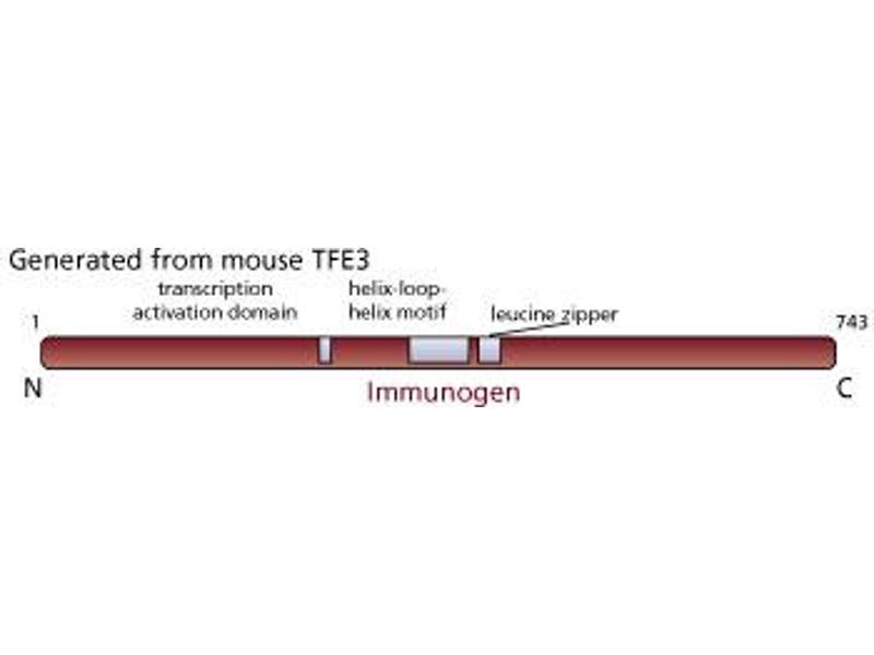 - TFE3 is a ubiquitously expressed 50 kDa transcription factor containing both basic helix-loop-helix (bHLH) and leucine zipper (ZIP) motifs. It was initially identified as a protein which bound to the µE3 site in the immunoglobulin heavy chain enhancer. In addition, it binds to the MLTF/USF site in the adenovirus major late promoter. Upon binding as a dimer, it induces a minor groove-oriented bend in the DNA, similar to other HLH proteins such as TFEB, USF, myc, and max. Binding results in transcriptional activation and is mediated through the basic region located just N-terminal to the HLH domain. Clone G138-312 recognizes TFE3. The antibody was raised against a bacterially expressed TFE3-L protein consisting of 327 amino acids encoded by nucleotides 361-2469 of the cloned cDNA.