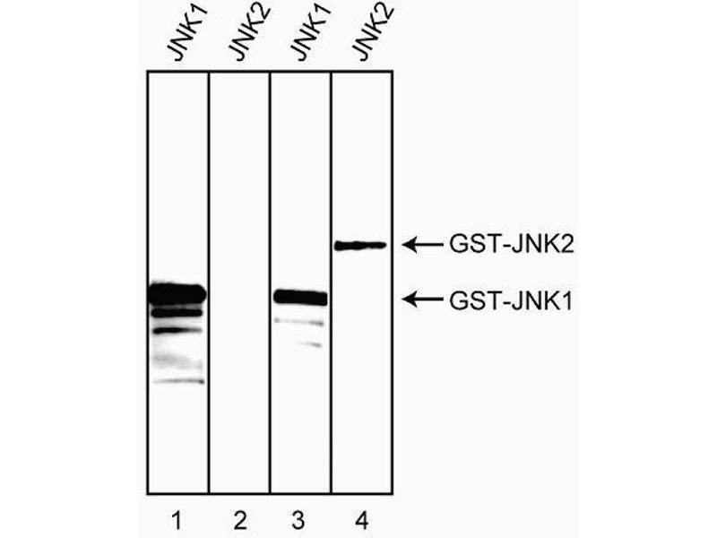 - C-Jun NH2-terminal kinase (JNK) binds to the c-Jun terminal transactivation domain and phosphorylates it on Ser-63 and Ser-73. Phosphorylation enhances the transcriptional activity of c-Jun. The Ser-Pro-acidic sequence targeted by JNK kinase activity establishes it as a prolinedirected kinase related to the MAP kinases and cyclin/dependent kinases. JNK may act as a tumor promoter in response to UV-irradiation since its activity is potently stimulated by radiation. This has relevance to observations that c-Jun transcriptional activity is upregulated by UV irradiation. In addition to UV irradiation, JNK is also activated by some other forms of cellular stress, including heatshock. Both the JNK1 (46 kDa) and JNK2 (54 kDa) isozymes appear equally capable of binding to the c-Jun terminal transactivation domain following induction by UV irradiation or heatshock. G151-666 recognizes both the JNK1 and JNK2 isozymes of JNK1. A bacterially expressed fusion protein of human JNK1 was used as immunogen.