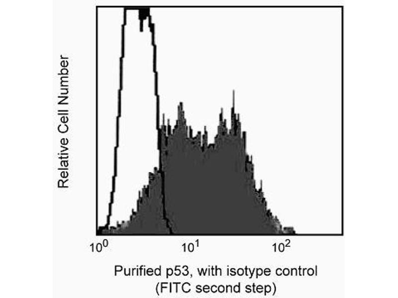 P53 is a 53 kD nuclear phosphoprotein that acts as a tumor suppressor protein, and is involved in inhibiting cell proliferation when DNA damage occurs. The gene for p53 is the most commonly mutated gene yet identified in human cancers. Missense mutations occur in tumors of the colon, lung, breast, ovary, bladder and several other organs. The mutant p53 is overexpressed in a variety of transformed cells and wildtype p53 forms specific complexes with several viral oncogenes including SV40 large T, E1B from adenovirus, and E6 from human papilloma virus. Wildtype p53 plays a role as a checkpoint protein for DNA damage during the G1/S-phase of the cell cycle. However, it is still unclear, whether point mutated forms of p53 are simple null mutants and/or dominant negatively acting proteins. The DO-7 antibody recognizes human wildtype and mutant p53. It cross-reacts with bovine p53 but does not cross-react with mouse or rat p53. DO-7 recognizes an epitope between amino acids 1-45 of known forms of human p53. Human recombinant p53 protein was used as immunogen. Wildtype 53 proteins have a very short half-life and are usually not detectable with monoclonal antibodies (mAbs) in normal tissues.