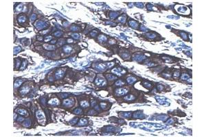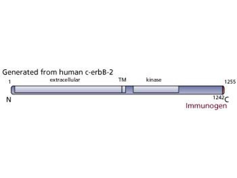 - C-erbB-2 (also known as HER2/neu), a 185 kDa transmembrane glycoprotein, is a member of the type 1 growth factor receptor subfamily which also includes c-erbB-3, c-erbB-4 and the epidermal growth factor receptor (EGFR), also known as c-erbB-1. Members of this receptor subfamily mediate the proliferation and differentiation of normal cells. They have a common structure consisting of an extracellular domain, a transmembrane region, and a cytoplasmic sequence. The extracellular regions contain two cysteine-rich domains, and the intracellular regions have sequence homology to known tyrosine kinases. C-erbB-2 reactivity has been detected in proximal kidney tubules, mucosal epithelium in the gastrointestinal tract, and squamous epithelium in skin. Most normal adult tissues show little or no reactivity with antibodies against c-erbB-2. However, c-erbB-2 is overexpressed in many human breast, stomach, ovary and bladder carcinomas. EGFR, c-erbB-3 and c-erbB-4 are also overexpressed in various human tumor cells, and it is thought that aberrant activation of type 1 growth factor kinase activities may contribute to tumor progression. The antibody 3B5 recognizes human c-erbB-2. A synthetic peptide corresponding to amino acids 1242-1255 (TAENPEYLGLDVPV) in the C-terminal domain of human c-erbB-2 was used as immunogen.