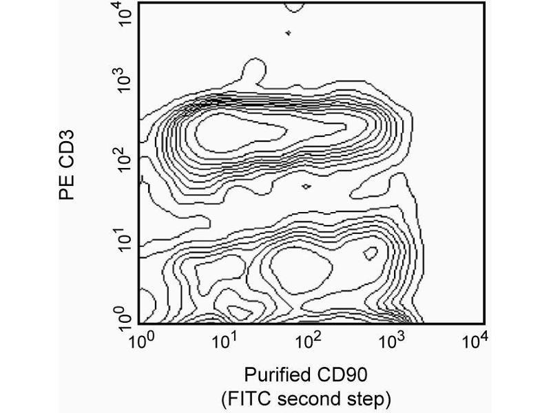 The OX-7 clone has been reported to crossreact with the mouse CD90.1 (Thy-1.1) alloantigen of the AKR/J and PL strains, but not CD90.2 (Thy-1.2) found on many mouse strains. In the mouse, CD90 is found on thymocytes, most peripheral T lymphocytes, some intraepithelial T lymphocytes (IEL, DEC), hematopoietic stem cells, and neurons, but not B lymphocytes. In addition, there is evidence that CD90 mediates adhesion of mouse thymocytes to mouse thymic stroma. The OX-7 clone has also been reported to crossreact with rabbit and guinea pig thymus, brain, and intestine.