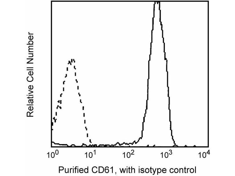 Reacts with integrin beta3, a 105 kDa transmembrane glycoprotein, expressed on platelets, megakaryocytes, osteoclasts and endothelia. Integrin beta3 associates with gpIIa (CD41) to form the CD41/CD61 complex which mediates platelet adhesion and aggregation. CD61 also associates with CD51 to form the CD51/CD61 complex (vitronectin receptor). CD61 appears to bind to fibrinogen, fibronectin, vWF, vitronectin, and thrombospondin to mediate cell adhesion. This antibody is routinely tested by flow cytometric analysis. Synonyms: Integrin beta3 Chain