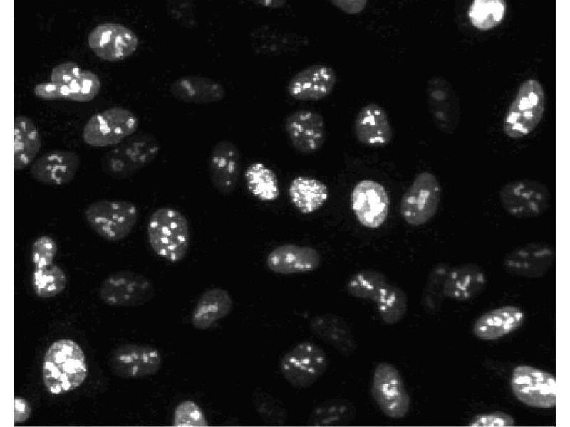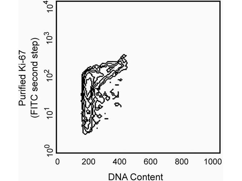 STAINING PROTOCOL FOR FLOW CYTOMETRY: 1. Harvest, count and pellet cells following standard procedures (Note:Ki-67 is expressed by the proliferative cells. You may get no staining with the resting cells, e.g., unstimulated PBMC). 2. While votexing, add 5 ml drop by drop of cold 70-80% ethanol into the cells pellet (1-5x10^7 cells). Then incubate at -20°C for 2 hours minimum. These fixed cells can be used up to 60 days after fixing (store at -20°C). 3. Add 30-40 ml wash buffer (PBS with 1% FBS, 0.09% NaN3, pH 7.2) to the fixed cells. Centrifuge the cells for 10 minutes at 1000 rpm and aspirate supernatant. Wash one more time with 30-40 ml wash buffer. Centrifuge at 1000 rpm for 10 minutes and aspirate supernatant. 4. Resuspend the cells to a concentration of 1 x 10^7/ml (1 x 10^6/100 µl). 5. Transfer 100 µl cell suspension into each fresh tube. 6. Add 20 µl of properly diluted antibody according to the protocol into the tubes above. Mix gently. 7. Incubate the tubes at room temperature (RT) for 20-30 minutes in the dark. 8. Wash with 2 ml of PBS washing buffer at 1000 rpm for 5 minutes. 9. Aspirate the supernatant. 10. For direct conjugated antibody: go to steps 13 & 14. 11. For purified antibody: add 50 µl of diluted secondary antibody at optimal concentration, incubate at RT for 30 minutes in the dark. 12. Repeat step 8 & 9. 13. Add 0.5 ml of PBS wash buffer into each tube. For FITC conjugated antibody, add µl of PI Staining Solution, for PE-conjugated antibody, add 20 µl Cell Viability Solution into each tube. 14. Analyze the sample with FACS.