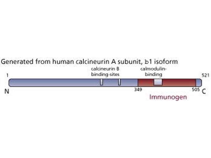 G182-1847 recognizes the alpha and beta isoforms of the A subunit of calcineurin (~61 kDa). It reacts with an epitope in the autoinhibitory domain. It does not recognize the B subunit of calcineurin. A recombinant tag-fusion protein containing amino acids 349-505 of the human beta1 isoform of calcineurin A subunit was used as immunogen. -