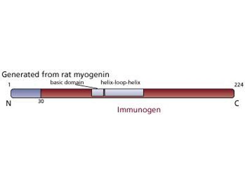 Myogenin is a member of the MyoD family of myogenic basic helix-loop-helix (bHLH) transcription factors that also includes MyoD, Myf-5, and MRF4 (also known as herculin or Myf-6). MyoD family members are expressed exclusively in skeletal muscle and play a key role in activating myogenesis by binding to enhancer sequences of muscle-specific genes. The regulatory domain of MyoD is approximately 70 amino acids in length and includes both a basic DNA binding motif and a bHLH dimerization motif. MyoD family members share about 80% amino acid homology in their bHLH motifs. Transfection of myogenin and other family members into a variety of non-muscle cells has been shown to either convert these cells to myogenic cells, or to transcriptionally activate a set of otherwise unexpressed muscle-specific genes. In addition to activating muscle-specific genes, members of the MyoD family members activate their own transcription and transactivate the transcription of other MyoD family members. For example, transfection of myogenin into 10T1/2 cells or Swiss 3T3 cells results in the activation of the endogenous myogenin gene as well as transactivation of MyoD. Likewise, the transfection of MyoD into these cells results in the activation of MyoD as well as the transactivation of myogenin. Each member of the MyoD family has distinct roles in muscle development, myogenin plays a key role in muscle maturation. Myogenin migrates at a molecular weight of ~34 kDa by SDS-PAGE. Clone F5D recognizes human, mouse, rat and cat myogenin. Mapping studies suggest that F5D reacts with an epitope between amino acids 138-158 of myogenin. A recombinant fusion protein corresponding to amino acids 30- 224 of rat myogenin was used as immunogen.