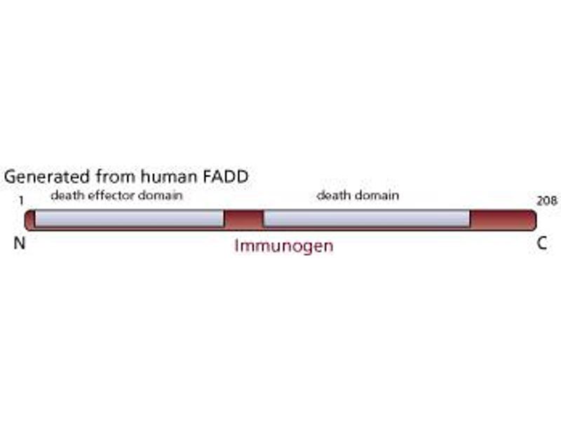 - FADD is a molecule involved in the Fas-mediated cell death pathway. Apoptosis is induced when Fas ligand or agonistic Fas antibodies bind to the Fas receptor, and trigger the activation of a cell death signaling pathway. Induction of Fas-mediated apoptosis requires a conserved cytoplasmic motif, referred to as the death domain, that is present in the C-terminal end of Fas. FADD also contains a death domain, and Fas and FADD bind to each other through their respective death domains. Death domains are thought to act as adaptor proteins by linking Fas and other members of the tumor necrosis factor receptor (TNFR) superfamily to downstream signaling pathways. Overexpression of FADD in vitro leads to cell death suggesting that FADD, like FAS, is an apoptosis-inducing protein. The N-terminal, but not the C-terminal death domain, is required for apoptosis induced by FADD overexpression. It is thought that the amino-terminal region of FADD functions by binding to caspase-3 and thereby linking signals from the cell surface to an apoptopic protease cascade. FADD has a calculated molecular weight of 24 kDa and migrates at a molecular weight of ~27 kDa in SDS/PAGE.