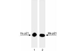 - Cyclins and cyclin-dependent kinases (cdks) are evolutionarily conserved proteins that are essential for cell-cycle control in eukaryotes. Cyclins (regulatory subunits) to form complexes that regulate the progression of the cell cycle. The activity of these complexes is modulated by activating and inhibitory phosphorylation events, as well as by interactions with small regulatory proteins including, p16, p21, p27 and others. These proteins, referred to as inhibitors of Cdk activity (CDkIs) bind to cyclins, cdks or their complexes. p21, also known as senescent cell-derived inhibitor 1 (Sdi1), wild-type p53-activated fragment 1 (Waf1), Cdk-interacting protein 1 (Cip1), and p53-regulated inhibitor of Cdks (Pic1) inhibits cyclin D-cdk4, cyclin E-cdk3, cyclin A-cdk2, and cyclin A-cdk1. p21 can also inhibit cell cycle progression by binding to PCNA and blocking DNA replication. p21 has also shown to be a component of active cyclin-cdk complexes, suggesting that p21-containing complexes may shift between active and inactive states through changes in p21 content. Active, p21-containing complexes appear to contain one p21 molecule, whereas inactive complexes contain multiple p21 molecules. The expression of p21 can be induced in response to number of signals, including transcriptional upregulation by the tumor suppressor protein, p53. Human p21 has a calculated molecular weight of 18 kDa and runs at 21 kDa in SDS-PAGE. The epitope has been mapped to the last 20 amino acids (residues 145-164) of human p21, one of the most conserved regions between human and mouse p21. Reaction of the antibody with overlapping peptides fragments suggest that the epitope may be further mapped to residues 145-156 (TSMTDFYHSKRR). This sequence overlaps with the sequence of p21 (KRRQTSMTDFYH) which is responsible for the specific interaction of p21 with PCNA. This antibody is routinely tested by western blot analysis.