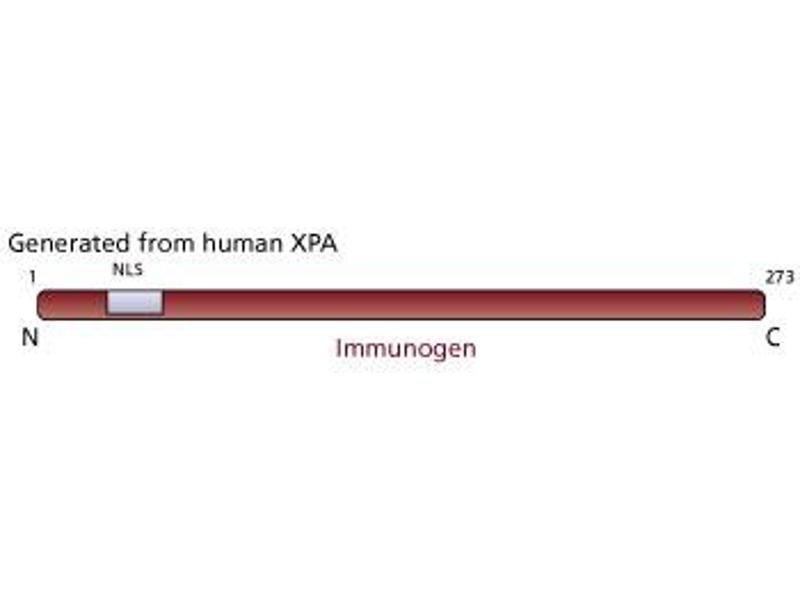 Nucleotide excision repair (NER) is a major pathway by which cells remove UV and chemically induced damage from DNA. The biochemistry of NER is complex and includes recognition of the damaged DNA, formation of incisions ~26-29 nucleotides apart on each side of the damaged DNA, excision of an oligonucleotide carrying the damaged DNA, and synthesis of a repair patch using the opposite DNA strand as a template. The xeroderma pigmentosum (XP) factors are the best characterized components in the NER pathway. They are termed XP-A to -G and are thought to be required for the first steps of the nucleotide excision repair process. XPA is a DNA damage-binding protein and XPC is a single stranded DNA-binding protein. XPB and XPD are DNA helicases that are components of the transcription factor TFIIH. The TFIIH complex is thought to be involved in transcription and NER. XPF is an endonuclease that binds to ERCC1 (for excision repair cross-complementing) and the ERCC1-XPF complex makes the incision 5' to the DNA damage. ERCC1 migrates at a molecular weight of ~36 kDa in SDS-PAGE. XPG is an endonuclease that makes the 3' incision. XPA has been reported to migrate at a molecular weight of 34-40 kDa in SDS-PAGE.