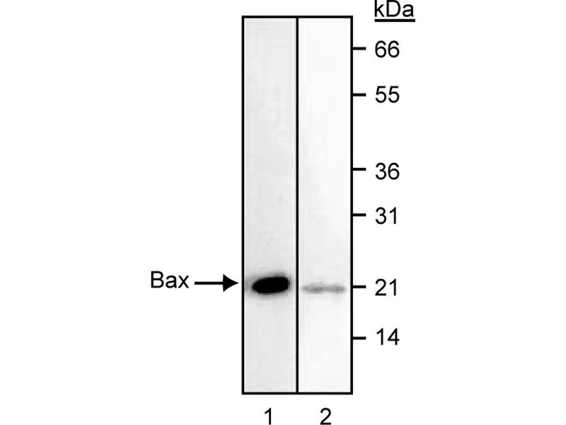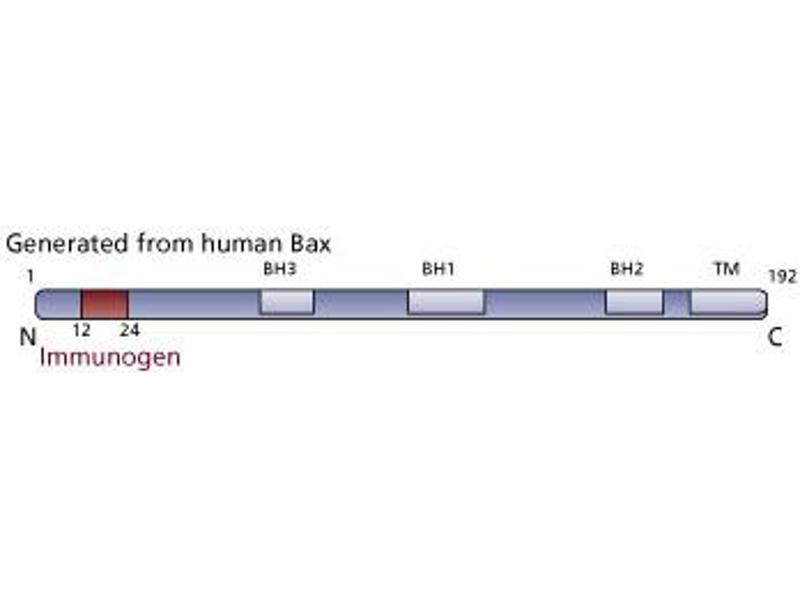 - The Bcl-2 family members are involved in mediating programmed cell death or apoptosis, and share two highly conserved functional regions, Bcl-2 homology 1 and 2 (BH1 and BH2). Several of the family members including Bcl-2 act as inhibitors of apoptosis, whereas others such as Bax promote cell death. It is thought that protein-protein interactions between Bcl-2 family members play an important role in their function. For example, Bax may form homodimers or heterodimers with either Bcl-2 and Bcl-XL (long). Bax homodimers is thought to promote cell death, whereas Bax heterodimerization with either Bcl-2 and Bcl-XL appears to block cell death. When Bax is present in excess, it can counteract the ability of Bcl-2 to inhibit cell death. Bax expression has been identified in a variety of tissues, including lung, stomach, kidney, thymus, lymph nodes, bone marrow, spleen, heart, exocrine pancreas, and brain. Liver, kidney, and the exocrine pancreas have been found to contain little or no Bcl-2. The Bax gene potentially encodes three different proteins Bax-alpha (21 kDa), Bax-beta (24 kDa) and Bax-gamma (5 kDa). Bax-alpha is the most common transcript. The 6A7 antibody recognizes human, mouse and rat Bax. The 6A7 antibody reacts with an epitope between amino acids 12-24 of Bax, and studies suggest that this epitope may be in the vicinity of the dimerization domain of Bax. It has been proposed that the 6A7 antibody may directly compete with either Bcl-2 or Bcl-XL for binding to Bax. In western blots, the 6A7 antibody typically detects Bax as a single band of 21-22 kDa, thought to be Bax-alpha.