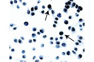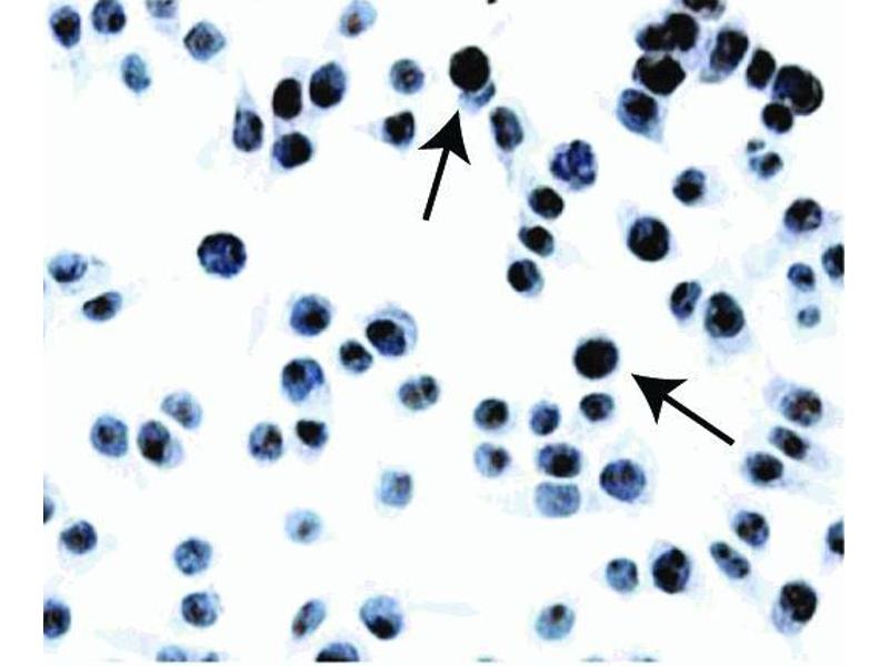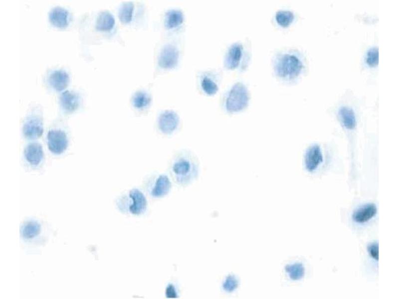 Applications include western blot analysis (0.5 to 4 µg/ml), immunoprecipitation (10 µg/ml), flow cytometry (0.06 to 1 µg/1 million cells) and immunohistochemical staining of acetone-fixed, frozen tissue cultured cells (40 µg/ml). Cells which are recommended as positive controls for detectable expression of MGMT include the following human cell lines: CEM lymphoblastic leukemia (ATCC CCL-119), MOLT-4 lymphoblastic leukemia (ATCC CRL 1582), A431 epidermoid carcinoma (ATCC CRL-1555), HeLa cervical carcinoma (ATCC CCL-2), Jurkat T cells (ATCC TIB-152) and Daudi Burkitt’s lymphoma (ATCC CCL-213). Negative cell lines include 293 embryonic kidney (ATCC CRL-1673), K562 leukemia cells (ATCC CCL-243) HL-60 promyelocytic leukemia (ATCC CCL-240) and U-937 histiocytic leukemia (ATCC CRL-1593). In immunohistochemical staining, the MGMT protein is observed exclusively in the nucleus of the cells.