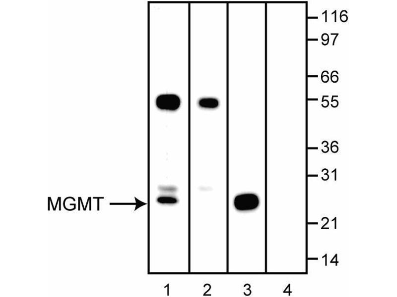 The repair of mismatched DNA is essential to maintaining the integrity of genetic information over time. The important role played by DNA repair enzymes is emphasized by the fact that they are highly conserved from bacteria to yeast to mammals. In bacteria, DNA repair involves the activity of repair enzymes including the MutL, MutH, and MutS proteins, as well as an enzyme originally identified in bacteria, and subsequently in all mammalian species, MGMT (methylguanine-DNA methyltransferase). Human MGMT is a 21 kDa protein which protects cells from the mutagenic effect of alkylating agents, which add a methyl group to the O6 position of guanine in DNA, producing O6-methylguanine. While MGMT is generally ubiquitously expressed in mammalian cells, the expression levels within cell and tissue types can be quite variable. Certain tumor cell types have been identified which express neither MGMT protein or mRNA, despite the apparent normal expression of the MGMT gene. The variable expression of MGMT may be a factor in the susceptibility of cells and tissues to the mutagenic effects of alkylating agents. It has been suggested that methylation of cytosine in the MGMT gene and promoter region may correlate with the expression of the MGMT gene product. MGMT is observed at 21 kDa on SDS-PAGE.