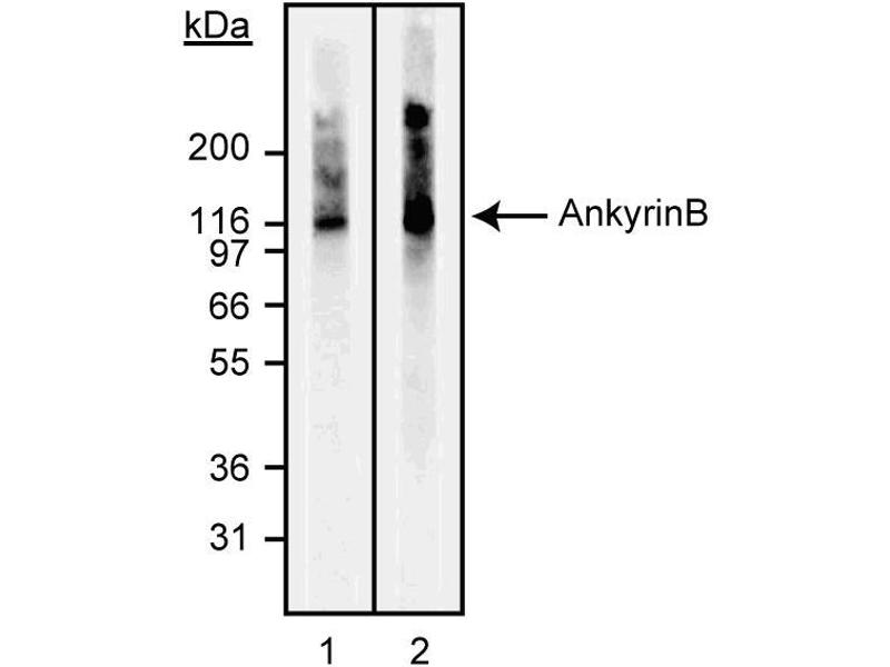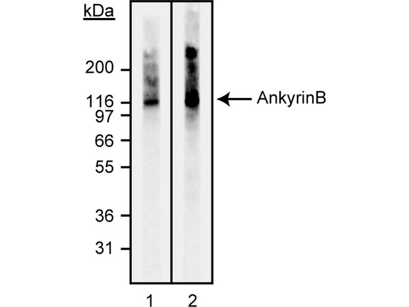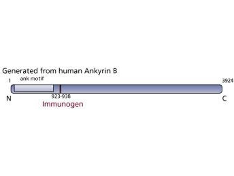 - Ankyrins are a family of proteins which were first discovered in erythrocytes and shown to bind to spectrin, a primary component of the cytoskeletal architecture. They have since been shown to be expressed at very high levels in the vertebrate brain and are also found in other cell types. Ankyrins function by acting as adaptors to link integral membrane proteins, including cell adhesion and ion channel molecules to the cytoskeleton. The structure of ankyrin consists of three domains, two highly conserved N-terminal and one C-terminal variable domain. The conserved regions contain a membrane-binding domain of ~89-95 kDa and a spectrin-binding domain of ~62 kDa, while the variable region has pre-mRNA alternative splice sites. Two ankyrins have been extensively characterized: ankryin R is the product of the ANK1 gene and is primarily expressed in the brain, although alternatively spliced forms are found in erythrocytes, ankyrin B is the product of the ANK2 gene, located on a different chromosome from ANK1, and is primarly expressed in neonatal and adult brain but is also found in heart, lymphocytes and platelets. Studies done on ankyrinB (-/-) knockout mice, which die by postnatal day 21, have demonstrated a link between the L1 cell adhesion molecule and ankyrin B in premyelinated axons. Isoforms of ankyrin B have been reported to be detectable ranging from approximately 440, 220, 150 and 110 kDa in western blot analysis, depending on the tissue-type of origin. This antibody is routinely tested by western blot analysis.