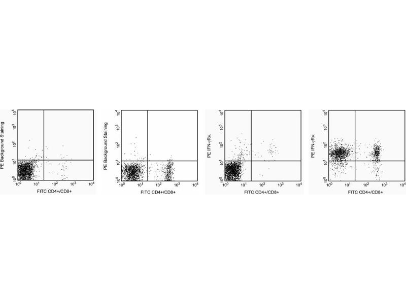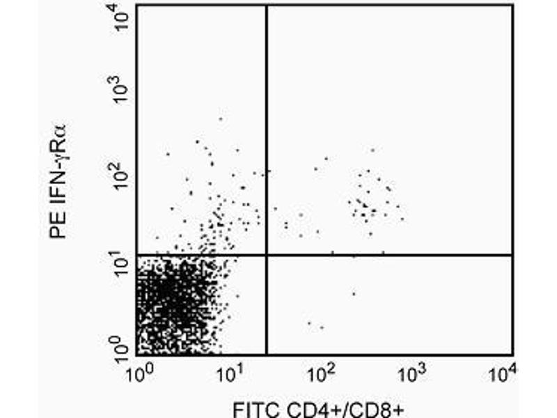 Immunofluorescent Staining and Flow Cytometric Analysis: The purified form of 2E2 can be used for the immunofluorescent staining (Less or equal than 1 µg antibody/10e6 cells) and flow cytometric analysis of normal mouse cells or cell lines to measure their expressed levels of IFN-gammaRalpha. An appropriate purified immunoglobulin isotype control is A19-3. A three-layer staining protocol is recommended for maximizing the detection IFN-gammaRalpha chains expressed by cells as detailed in the figure legend. 2E2 is a nonblocking antibody that can be used for the unobstructed immunofluorescent staining and flow cytometric analysis of cells in systems where the ligand (i.e., IFN-gamma) for IFN-gamma receptors is present. Immunoprecipitation: The 2E2 antibody has been reported to be useful for the immunoprecipitation of IFN-gammaRalpha chains from lysates of cloned mouse T cells.