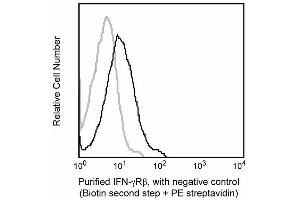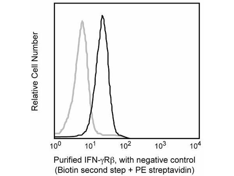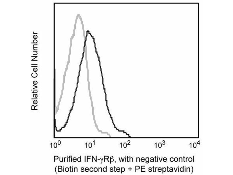 Immunofluorescent Staining and Flow Cytometric Analysis: The purified form of MOB-47 (ABIN967655) can be used for the immunofluorescent staining (Less or equal than 1 µg antibody/10e6 cells) and flow cytometric analysis of normal mouse cells or cell lines to measure their expressed levels of IFN-gammaRbeta. An appropriate purified immunoglobulin isotype control is clone A19-3. A three-layer staining protocol is recommended for maximizing the detection IFN-gammaRbeta chains expressed by cells as detailed in the figure legend.