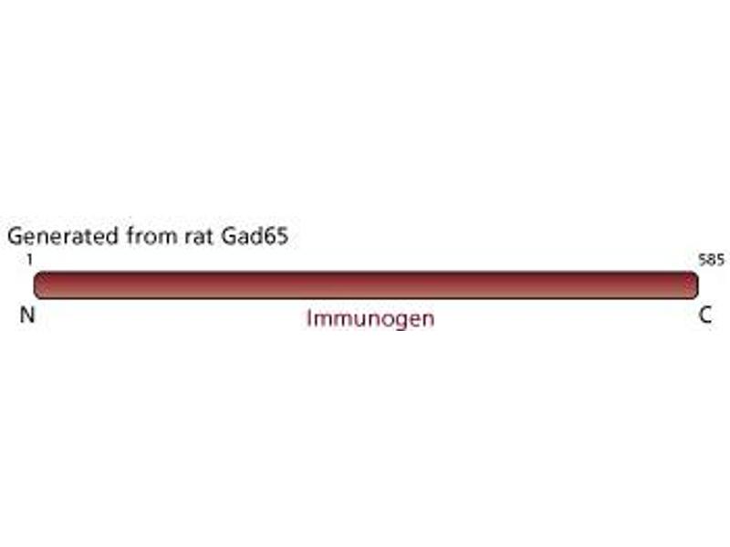 Gamma-aminobutyric acid (GABA) is an amino acid neurotransmitter that is considered to be the major inhibitory neurotransmitter in the mammalian central nervous system. The highest concentrations of GABA are found in the brain, where it is synthesized from glutamic acid to GABA by an enzyme called glutamic acid decarboxylase (GAD). GAD is also expressed in the insulin-producing beta cells of the islets of Langerhans. Two isoforms of GAD are present in rat brain, GAD65 and GAD67, based on their relative molecular weight in kDa. Both isoforms have significant levels of homology in the catalytic portion of the molecule, but differ greatly in the first 95 amino acids in the N-terminal region. GAD65 migrates at ~65 kDa in SDS/PAGE. The antibody is reported to recognize rat, human, mouse, and pig GAD65. Purified GAD65 from rat brain was used as the immunogen. The specific epitope recognized by this clone is a linear epitope localized in the last 41 amino acids of GAD65.