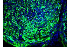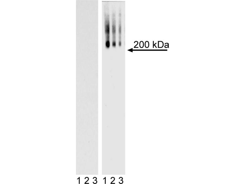 The TRA-1-60 monoclonal antibody reacts with the neuraminidase-resistant form of a pluripotent-stem-cell-specific epitope on a high-molecular-weight transmembrane glycoprotein. The TRA-1-60 antigen is a sialylated epitope on the same keratan sulfate core molecule, podocalyxin, as 4 other distinct antigens on tumor-derived cell lines, TRA-1-81, GCTM2, K4, and K21. The expression of TRA-1-60 antigen is stage-specific and can be used to characterize embryonic cells and monitor their differentiation. The antigen is found on teratocarcinoma (embryonal carcinoma or EC), embryonic inner cell mass (but not morula or trophoblast), and embryonic stem (ES) cells. TRA-1-60 antigen is released into the serum of patients bearing testicular tumors containing EC cells. As human EC and ES cells undergo differentiation, expression of TRA-1-60 antigen is lost. Expression of TRA-1-60 antigen has also been observed on a rhesus monkey ES cell line (Thomson et al, 1995).