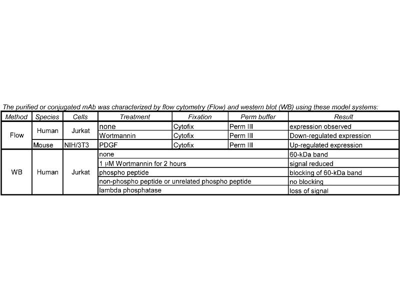 Akt [also known as PKB (Protein kinase B) or RAC-PK (Related to the A and C kinases)] is a family of serine/threonine kinases that contains a pleckstrin homology (PH) domain. PH domains play important roles in signal transduction. There are three known isoforms of Akt in mammalian cells [Akt1 (alpha), Akt2 (beta) and Akt3 (gamma)], they are thought to be regulated similarly. Akt is activated by insulin and growth factors by a mechanism involving phosphoinositide 3-OH kinase. Phosphoinositide 3-OH kinases products bind to the PH domain, resulting in translocation of Akt to the plasma membrane and activation of Akt to phospho-Akt by upstream kinases. Akt is phosphorylated within the activation loop at threonine 308 and the C-terminus at serine 473 (S473). Phospho-Akt promotes cell survival by inhibiting apoptosis. Specifically, phospho-Akt1 has been shown to phosphorylate Bad, a member of the Bcl-2 family that promotes cell death. This phosphorylation results in the inactivation of the proapoptotic function of Bad. The Akt molecule is thus considered to link extracellular survival signals (growth factors) with the apoptotic machinery (BAD). Akt is also a key mediator of the metabolic effects of insulin. Additionally, Akt has been referred to as an oncogene because it has increased activity in a number of tumors. The M89-61 antibody recognizes Akt phosphorylated at S473. This phosphorylation site is shared by all three isoforms of Akt. The homologous phosphorylation sites in Akt2 and Akt3 are S474 and S472, respectively.