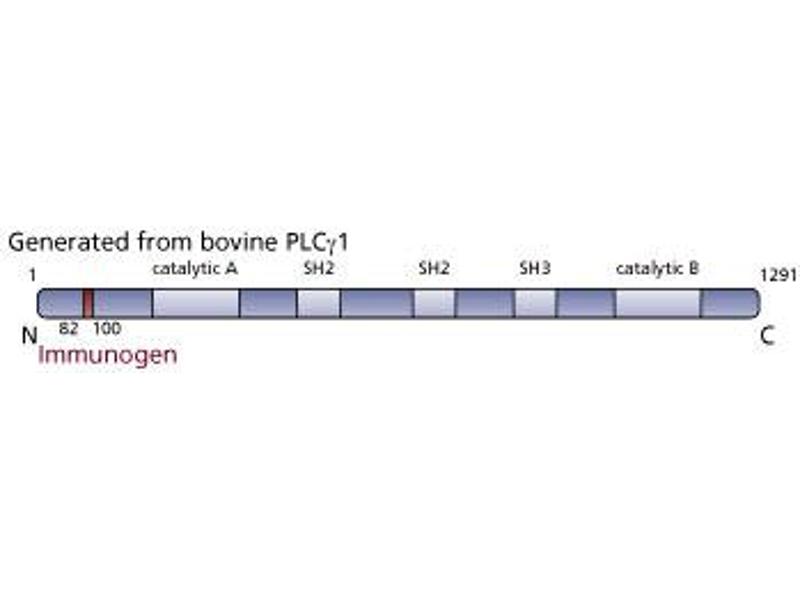 The Phospholipase C (PLC) isozymes hydrolyze phosphatidyl inositol biphosphate to inositol triphosphate and diacylglycerol. The former causes release of calcium from the endoplasmic reticulum, while the latter is an activator of Protein Kinase C. Within the PLC family, PLCg is the only member that contains SH2 and SH3 domains. These domains enable it to interact with receptor tyrosine kinases and become enzymatically activated via phosphorylation. It exists as two isoforms: 1) PLCg1, which is ubiquitously expressed, and 2) PLCg2, found primarily in the lymphoid system. PLCg is essential for growth factor-induced cell motility and mitogenesis. PLCg1 null mice exhibit retarded embryonic growth and lethality in midgestation. Overexpression of PLCg is evident in several forms of cancer, and it has been identified as a key mediator of PDGF-dependent cellular transformation. Thus regulation of PLCg activity by growth factors is involved in cell growth and transformation.