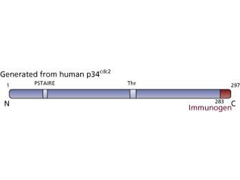 Cdk1, also known as p34 [cdc2], is a ubiquitously expressed serine/threonine protein kinase. Cdk1/cdc2 has been identified as the catalytic subunit of the maturation-promoting factor (MPF), while cyclin B acts as the regulatory subunit. The binding of these two subunits is critical to the transition into M-phase of the mammalian cell cycle, and this factor's role is regulated by a series of phosphorylations and dephosphorylations. After binding to cyclin B, cdk1/cdc2 is phosphorylated on Thr-14, by Myt1, and Tyr-15, by wee1 or mik1, yielding an inactive pre-MPF complex. Phosphorylation of cdk1/cdc2 on Thr-161 is performed by a cdk7/cyclin H complex and is necessary for activation of the cdc2 complex. Dephosphorylation of Thr-14 and Tyr-15 by CDC25 occurs at the prophase/metaphase transition and completes activation of the cdc2/cyclin B complex, initiating the cell's entry into mitosis. This antibody is routinely tested by western blot analysis.