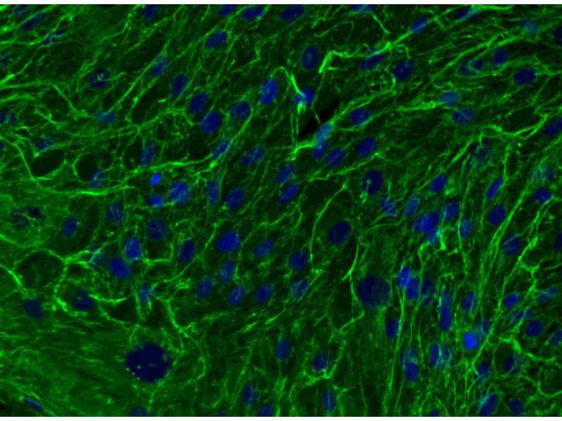 The 240 kDa dimeric fibronectin protein exists in two forms: a soluble protomer in body fluids and an insoluble multimer in the extracellular matrix. The latter is the primary functional form and creates a substrate for cell migration, a role which makes fibronectin vital to embryogenesis and wound response. Fibronectin mediates cytoskeletal organization, cell attachment, and cellular signaling through interactions with cellular receptors. Although various isoforms of fibronectin are derived by alternative splicing, they share a common N-terminus which is a critical region for cell surface binding in an initial step of multimer assembly. Further polymerization steps are regulated by fibronectin/integrin interactions and result in generation of the complex fibrils that constitute the fibronectin matrix.