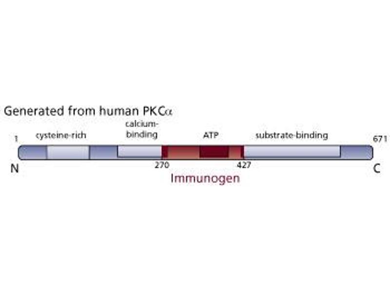 The Protein Kinase C (PKC) family of homologous serine/threonine protein kinases is involved in a number of processes such as growth, differentiation, and cytokine secretion. At least eleven isozymes have been described. These proteins are products of multiple genes and alternative splicing. PKC consists of a single polypeptide chain containing four conserved regions (C) and five variable regions (V). The N-terminal half containing C1, C2, V1, and V2 constitutes the regulatory domain and interacts with PKC activators Ca2+, phospholipid, diacylglycerol, or phorbol ester. However, the novel PKC (nPKC) subfamily members ( delta, epsilon, eta, and theta isoforms) and the atypical PKC (aPKC) subfamily members (zeta, iota, and lambda isoforms) are Ca2+ independent and lack the C2 domain. The aPKC members are unique in that their activity is independent of diacylglycerols and phorbol esters. They also lack one repeat of the cysteine-rich sequences that are conserved in cPKC and nPKC. The C-terminal region of PKC contains the catalytic domain. The PKC pathway represents a major signal transduction system that is activated following ligand-stimulation of transmembrane receptors by hormones, neurotransmitters and growth factors. Overexpression of PKCalpha has been reported to lead to an enhanced growth rate and induces the phosphorylation of two cellular proteins of 52 kDa and 90 kDa. This antibody is routinely tested by western blot analysis.