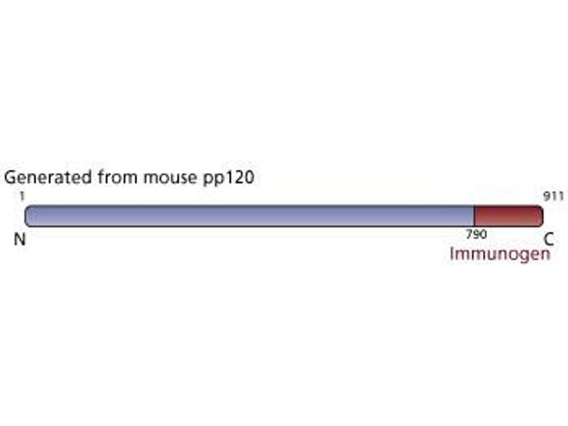 The membrane associated protein p120 Catenin (pp120 (Src substrate), p120cas) was identified as a tyrosine kinase substrate that is phosphorylated in Src transformed cells or in response to growth factor stimulation. It shares structural similarity with the Drosophila Armadillo protein and the vertebrate beta-catenin and gamma-catenin proteins. This similarity is evidenced by its characteristic Arm domain that is composed of 42-amino acid motif repeats. In the cell, p120 Catenin is localized to the E-Cadherin/catenins cell adhesion complex. Like beta- and gamma-catenin, p120 Catenin directly associates with the cytoplasmic C-terminus of E-Cadherin via its Arm domain and may similarly interact with other Cadherins. It exists as four isoforms that range in size from 90-115 kDa. Expression of these isoforms is heterogeneous in human carcinomas, suggesting that altered pp120 expression contributes to malignancy due to loss of functional cell adhesions. Multiple tyrosine residues (Y96, Y112, Y228, Y280, Y257, Y291, Y296, and Y302) in p120 Catenin are phosphorylated by Src and these phosphorylations may facilitate interaction with PTP1C/SHP-1 in response to EGF stimulation. Thus, p120 Catenin is an Arm domain protein that interacts with both cell adhesion molecules, such as cadherins and cell signaling molecules, such as PTP1C.