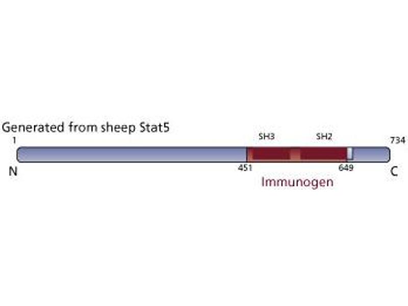 Stat5, also known as mammary gland factor (MGF) has been shown to play a critical role in the lactogenic hormone response and has been well characterized in mammary epithelial cells. The SH3 domain of MGF shows extensive homology with the SH2 domains of Stat1 and Stat2. This homology has led to its classification as a member of the Stat family. The Stat proteins function both as cytoplasmic signal transducers and as activators of transcription. Stat (Signal transducer and activators of transcription) proteins are critical mediators of the biologic activity of cytokines, including interleukins, interferons, erythropoietin, and growth factors. Ligand-receptor interaction leads to activation of constitutively associated JAK family kinases and subsequent recruitment and activation of Stat proteins by tyrosine phosphorylation. Active Stat proteins then move to the nucleus to promote transcription of cytokine-inducible genes. Stat5a has been shown to be involved in lactogenesis and mammary development, while Stat5b has been shown to be involved in growth hormone signaling and to play a role in liver gene expression. Stat5 activity is tightly regulated throughout gestation, lactation, and post-lactation.