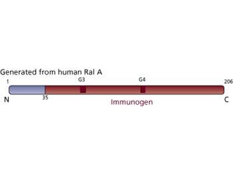 - Ral is a low molecular weight GTP-binding protein belonging to the Ras superfamily of GTP-binding proteins and shows 50% amino acid identity to Ras. Ral cDNA clones have been isolated from human placenta, human pheochromocytoma, simian ß-lymphocyte, and marine ray electric lobe cDNA libraries. In humans, cDNA sequences for Ral A and RalB have been determined. The predicted amino acid sequences show 85% identity. Both proteins consist of 206 amino acids with a predicted molecular weight of 24kDa. However, Ral A isolated from human platelets shows an apparent molecular weight of 26-28kDa. Ral A mRNA levels in adult mouse tissues appear to be highest in testes, ovary, and brain, with lower levels found in the liver, spleen, kidney, thymus, heart, and salivary glands. Similar results have been observed in rat tissues. This antibody is routinely tested by western blot analysis.