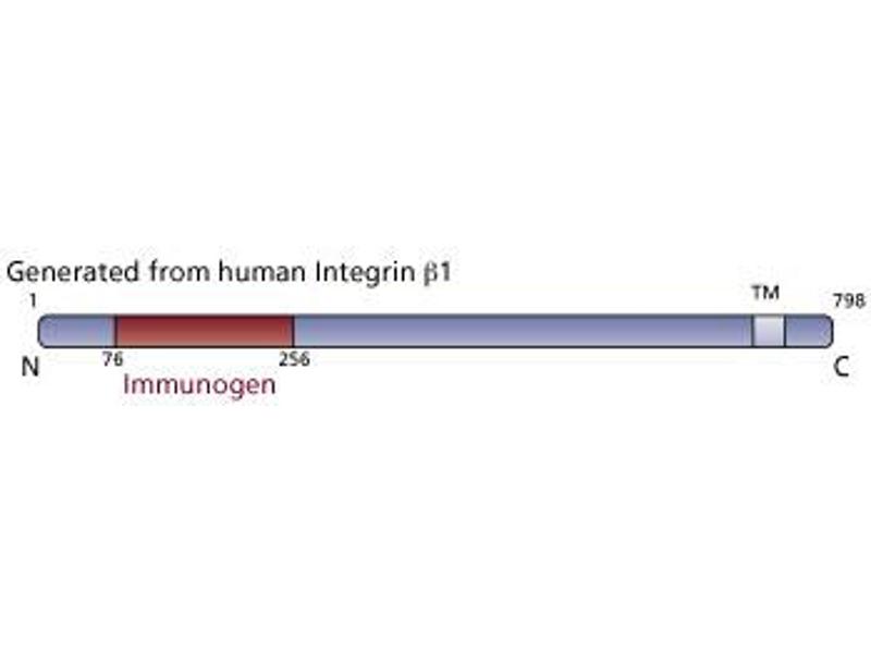 Integrins are membrane receptors that mediate cell-cell or cell-matrix adhesion. All integrins are transmembrane heterodimers composed of alpha and beta subunits and are connected to the cytoskeleton. At least 20 integrins, formed from combinations of 12 alpha and 9 beta subunits, have been reported. Many of these have been implicated as transducers of molecular signals. The beta1 subgroup of this receptor family comprises at least six different dimer combinations. Among these combinations, alpha2beta1 is associated with type I collagen and laminin binding and regulation, alpha3beta1 is a receptor for laminin and epiligrin, and alpha5beta1 is a fibronectin receptor. beta1 integrins play an important role in several aspects of epidermal differentiation and morphogenesis. Expression of the beta1 subunit is regulated by growth factors such as TGF-beta1. Integrin activation, which enhances binding of T cells to endothelium, is regulated in part by phosphatidylinositol 3-kinase. Focal adhesion kinase (FAK) and paxillin have been reported to independently bind the C-terminal, cytoplasmic domain of the beta1 subunit. FAK is reported to be enzymatically activated upon engagement of integrins with their ligands and paxillin is phosphorylated on tyrosine upon activation of FAK.