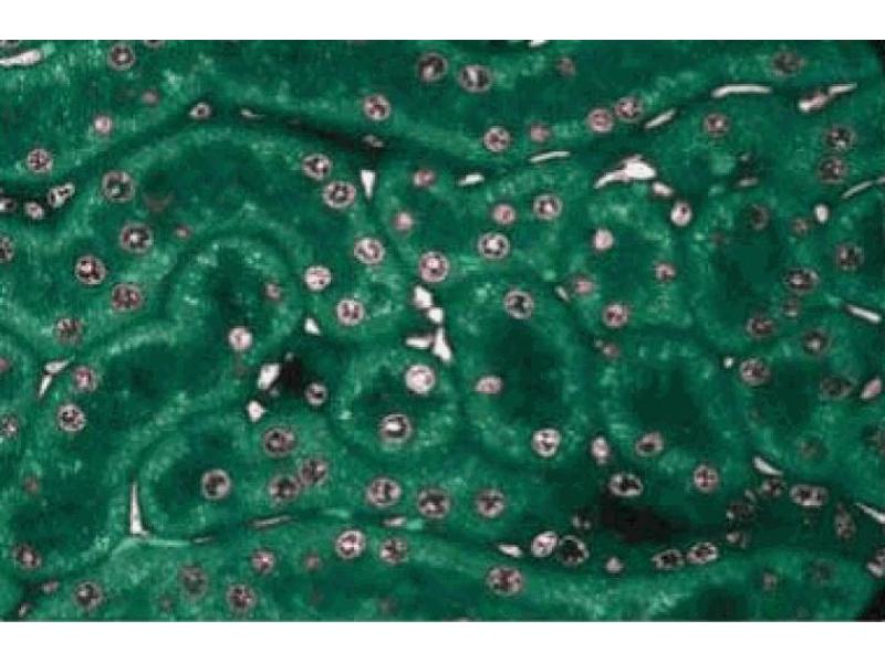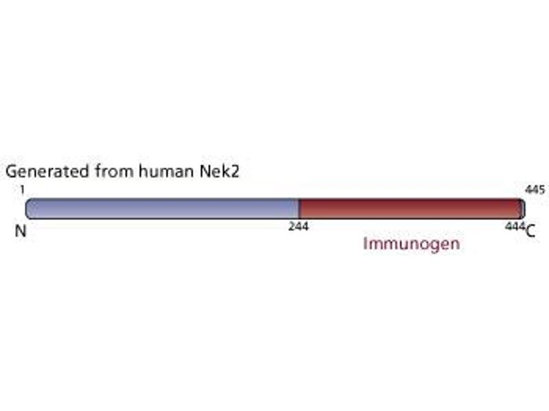 Reversible protein phosphorylation is critical for progression through the cell cycle and mitosis. In Aspergillus nidulans, the nima gene (never in mitosis) encodes a protein kinase that is essential for mitosis. Three human genes (nek1, 2, and 3 [Nima-related kinase]) with significant homology to the A. nidulans nima have been reported. The nek2 gene encodes a protein of 445 amino acids and, like its fungal homolog, its expression is regulated throughout the cell cycle. In Hela cells, Nek2 activity and expression are low during M and G1 phases of the cell cycle. However, both parameters increase during S phase and mitosis. In addition, Nek2 phosphorylates protein substrates exclusively at serine and threonine residues. Thus, like its fungal homolog, Nek2 may be a crucial element in controlling the cell's entry into S phase and mitosis. This antibody is routinely tested by western blot analysis.