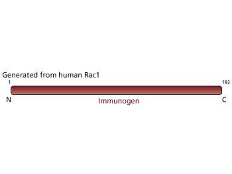 - Rac1 is a member of the expanding family of Ras-related GTPase proteins. These small proteins have the ability to switch between two different conformational states: the active (GTP-bound) and the inactive (GDP-bound). The GTPase activity is increased by specific activator proteins named GAPs. Rac1, like many of its relatives, contains the consensus sequence Cys-X-X-X-COOH, which localizes it to the plasma membrane. Growth factor stimulation of cells results in a dramatic reorganization of the actin filament network and membrane ruffling, processes for which Rac1 is essential. Constitutive expression of Rac1 leads to cell transformation. This process is mediated by the Rac1-dependent activation of the p65PAK serine/threonine kinase. In addition, IQGAP1 has been identified as a GTPase activating protein specific for Rac1. Due to sequence homology among various small GTPase family members, potential cross-reactivity could be observed with this antibody. This antibody is routinely tested by western blot analysis.