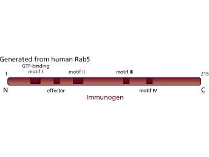- Rab5 is a low molecular weight GTP-binding protein that plays a role in endocytic vesicle traffic. Like other Rab proteins, Rab5 has C-terminal cysteine residues that are post-translationally modified by geranylgeranylation which is critical for its membrane targeting. Rab5 is associated with early endosome and plasma membranes and evidence suggests that Rab5 regulates early endosome fusion. The GTP/GDP cycle controls shuttling of Rab proteins between the cytosol and membranes. In vitro, Rab5 proteins are removed from membranes by a GDP dissociation inhibitor protein (rabGDI) which leads to the formation of a cytosolic Rab5-rabGDI complex. Rab5 may insert into membranes by a multistep process in a which a transient GDP-Rab5 intermediate is formed and converted into GTP-Rab5 that subsequently enters the acceptor membrane and releases rabGDI into the cytosol. This antibody is routinely tested by western blot analysis.