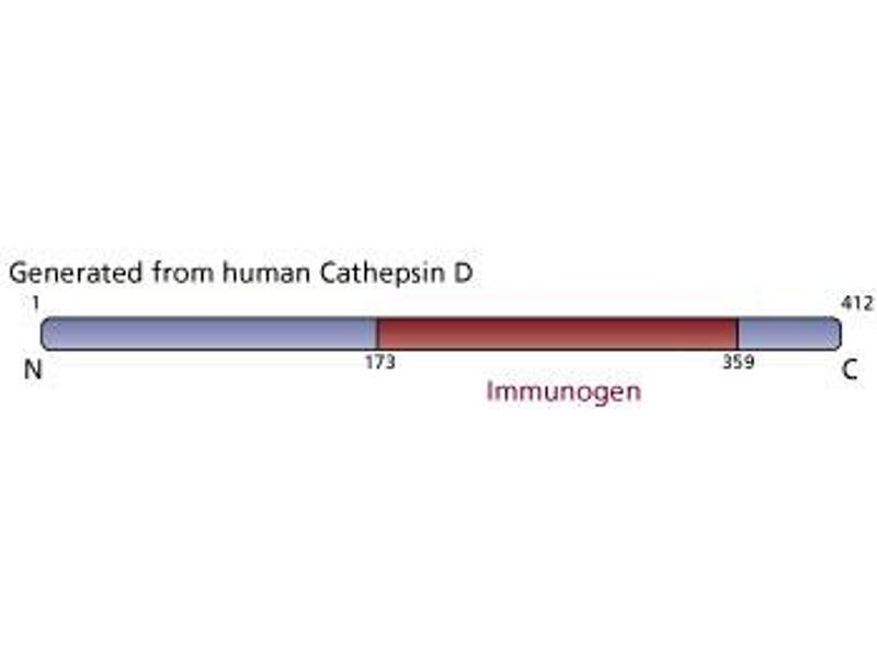 - Cathepsin D, an enzyme that degrades proteins, was originally cloned during the search of estrogen responsive genes in MCF-7 cells. Cathepsin D is synthesized as the 43kDa preprocathepsin D that is cleaved to form a 46kDa glycosylated procathepsin D. Procathepsin is then processed into a 44kDa active Cathepsin D. The active and mature forms undergo a further cleavage that yields 28kDa and 15kDa (heavy and light chains, respectively) fragments in SDS-PAGE. The heavy and light chains of Cathepsin D are released into the extracellular medium. The maturation process of Cathepsin D occurs through the transit from the endoplasmic reticulum, Golgi apparatus, and to the lysosomes. Estrogens stimulate cell proliferation in a number of tumor cell lines and anti-estrogen therapy is often used in the treatment of breast cancer patients. Therefore, Cathepsin D, which is estrogen inducible, may have a role during the pathogenesis of breast tumors. Additionally, several other roles have been proposed for this enzyme, such as tissue remodeling, tumor invasion, and embryo implantation.