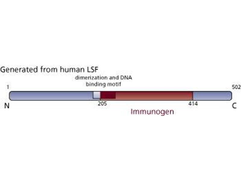 LSF (alphaCP2 or LBP-1c) is a transcription factor originally identified by its binding to, and induction of, the SV40 late promoter. LSF displays some similarity to the Elf-1/NTF transcription factors of Drosophila. It is primarily found in its dimeric form in solution, however it is the tetrameric form that recognizes a center-to-center 10 bp repeat. LSF-1D (LBP-1d) is the product of an alternative splicing event, resulting in a deletion of a 51 amino acid segment that corresponds with the DNA-binding region of LSF. LSF-1D is found in the cytoplasm, not in the nucleus, and can interact with LSF to form a heterotetramer that can interfere with LSF DNA binding. In mitogen-stimulated human peripheral T cells, LSF is phosphorylated on amino acid 291, which increases its DNA binding activity. Thus, LSF-mediated gene transcription is regulated by its phosphorylation and/or its interaction with LSF-1D during cell growth. This antibody is routinely tested by western blot analysis.
