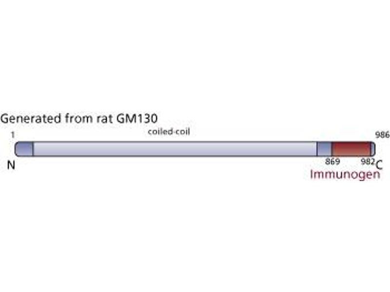 - Maturation and post-translational modification of proteins occurs after their biosynthesis at the endoplasmic reticulum and their transport through the Golgi apparatus. The process involves the transport of vesicles carrying the proteins through a vectorial process of vesicle budding and fusion from the cis-compartment to the medial-compartment and the trans-compartment of the Golgi apparatus. The detergent insoluble fraction of the Golgi is named matrix and is required for proper morphology of the Golgi membranes. GM130 (Golgi matrix protein of 130 kDa) is a protein isolated from the Triton™ X-100-insoluble Golgi matrix and peripherally associated with the cis-compartment, as demonstrated by co-localization with syntaxin5. GM130 is homologous to the Golgi autoantigen golgin 95. GM130 interacts through its N-terminal domain with p115 and with the Golgi membranes at the C-terminal portion. Furthermore, the mitotic phosphorylation of GM130 blocks the interaction with p115. Thus, GM130 appears to function as a structural element of the Golgi apparatus that also provides attachment sites for membranes and other Golgi proteins. The 35/GM130 monoclonal antibody recognizes GM130, regardless of phosphorylation status.