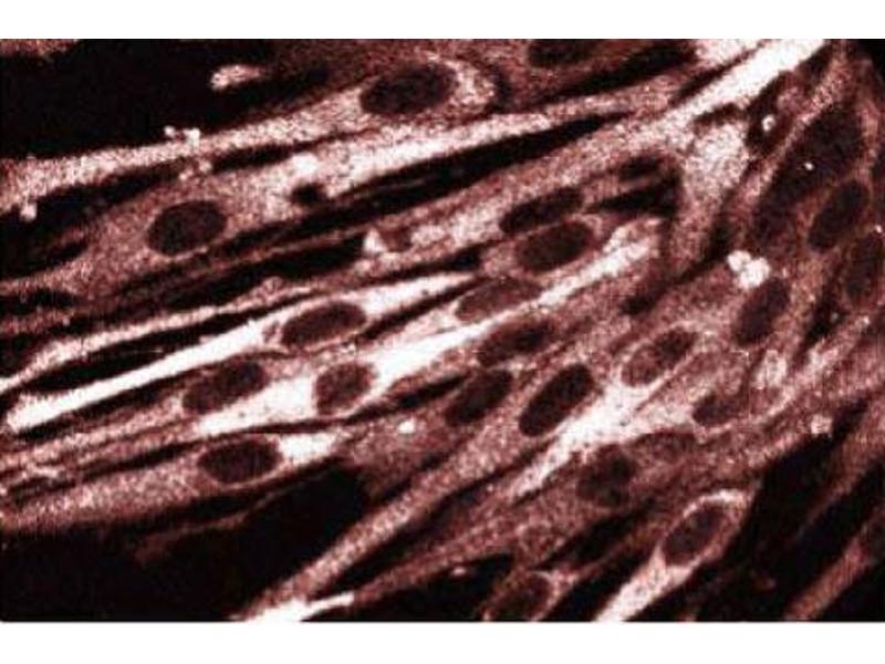 GTPases like Ras, Rho, cdc42Hs, and Rac modulate a multitude of cellular functions like cytoskeletal architecture, growth, motility, and gene expression. The activity of the GTP-binding proteins is regulated by factors that accelerate GTP-binding (GAPs) and proteins that enhance the rate of GTP hydrolysis. mDia1, also known as p140mDia and Drf1, is the mammalian homologue of Drosophila's diaphanous, a protein essential for cytokinesis. The 1255 amino acid mDia1 is widely expressed, with a Rho binding domain at the NH2-terminal region, a central polyproline region, and an FH2 domain. This protein also shares homology with the yeast Bn1p essential for budding and the mouse formin necessary for proper limb development. mDia1 binds to GTP-Rho and to the actin-binding protein profilin-all three proteins are co-localized at the lamellipodia in cultured cells. The overexpression of mDia1 promoted the formation of actin filaments, implicating this protein in cell motility events regulated by Rho. mDia1 was also found consistently mutated in familial deafness.