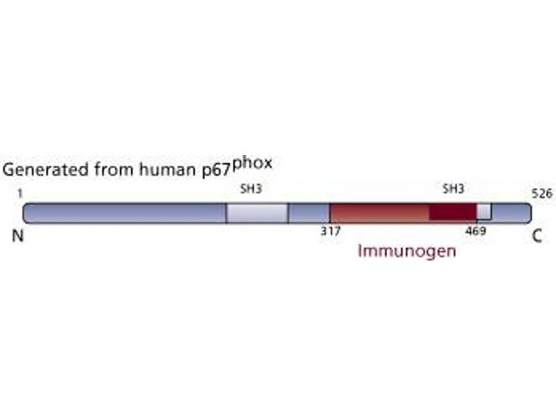 - The neutrophil respiratory burst oxidase (NADPH-oxidase) generates superoxide and secondary oxygen-derived toxic products in response to bacteria or a variety of soluble stimuli. The active site of this enzyme is located in an integral membrane cytochrome, b558, that consists of the two subunits gp91 [phox] and p21 [phox]. Superoxide production depends on the formation of a complex that includes p67 [phox], p47 [phox], and the GTP-binding protein Rac. Upon activation, these proteins translocate from the cytosol to the membrane where they assemble with b558 and induce oxidase activity. p67 [phox] contains two SH3 domains and binds, via its C-terminal SH3 domain, to the proline rich region of p47 [phox]. This binding allows p67 [phox] to indirectly associate with the oxidase. It is thought that the phosphorylated forms of p67 [phox] and p47 [phox] interact and that the phosphorylation of p67 [phox] is regulated by both PKC-dependent and independent pathways. Although the role of p67 [phox] in electron flow control is poorly understood, it is thought that it regulates the transfer of electrons from NADPH to reduce flavin.