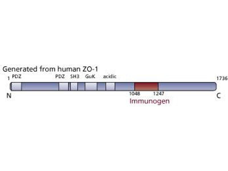 - Tight junctions (zonulae occludens) are critical to the maintenance of cell polarity and intracellular barriers between epithelial and endothelial cells. Protein components of the tight junctions include actin filaments, symplekin, occludin, Rab3B, AF-6, 7H6, ZO-1, and ZO-2. Analysis of ZO-1 and -2 resulted in their inclusion in the MAGUK protein family. This family also includes the discs large tumor suppressor protein (Dlg-A) of Drosophila, p55, an erythrocyte membrane protein, and PSD-95/SAP90, a synaptic membrane protein. All family members contain a region homologous to guanylate kinase (GuK), a src homology (SH3) domain, and multiple PDZ domains. Through these elements, MAGUK proteins function in signal transduction and, possibly, tumor suppression. ZO-1 is a peripheral membrane phosphoprotein that binds to other tight junction proteins such as occludin and AF-6. Via its SH3 domain, ZO-1 interacts with a serine protein kinase that phosphorylates a region immediately C-terminal of the SH3 domain. Taken together, these data indicate that ZO-1 is a critical element in the formation of tight junctions and may also serve an important role in signaling and tumor suppression. This antibody is routinely tested by western blot analysis.
