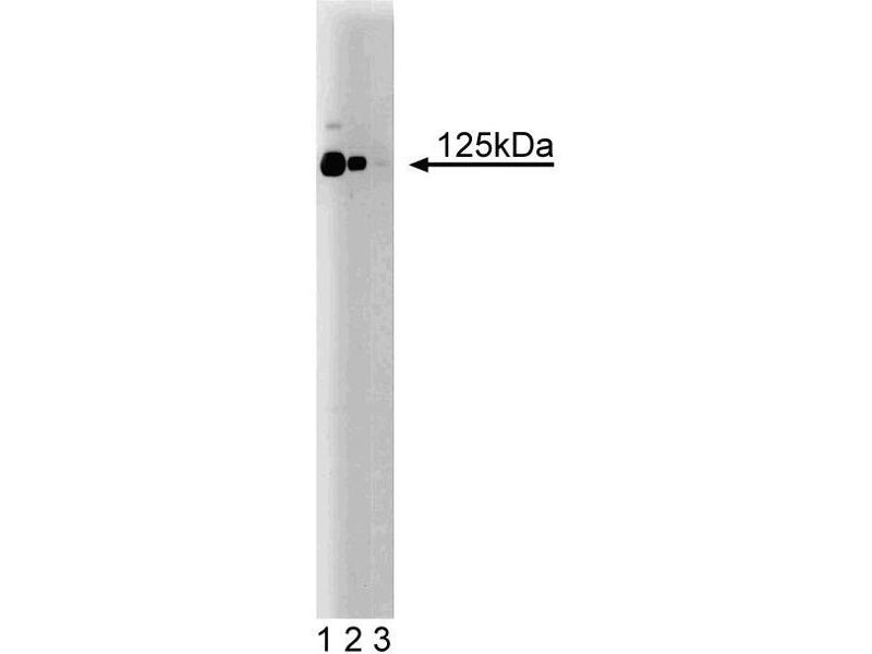 Integrins are a family of proteins that mediate intercellular adhesion or adherence to extracellular matrix proteins. Their roles are essential for embryonic development, tumor metastasis, organ function, and proper immune cell function. Family members are heterodimers that contain a larger alpha subunit that is unique to each individual receptor and a smaller beta subunit that can be shared by several receptors. Based on beta subunit content, integrins are divided into the subfamilies beta1, beta2, and beta3. The beta3 subfamily contains the vitronectin receptor (alphaVbeta3) and the platelet protein gpIIb/IIIa. The alpha chain of the vitronectin receptor (VNRalpha, CD51, integrin alphaV) has been reported to consist of a disulfide-linked large extracellular (125 kDa) subunit and a smaller (25 kDa) membrane-anchored subunit. The large subunit contains multiple sequences with homology to calcium-binding sites in other proteins and an RGD-dependent ligand-binding site, while the small subunit contains a transmembrane domain and a short cytoplasmic domain. VNRalpha has been reported to be noncovalently associated with the VNR beta3-chain (CD61, gpIIIa). The VNR mediates cell adhesion to RGD-containing ligands such as vitronectin, von Willebrand factor, fibrinogen, and thrombospondin. This antibody is routinely tested by western blot analysis.