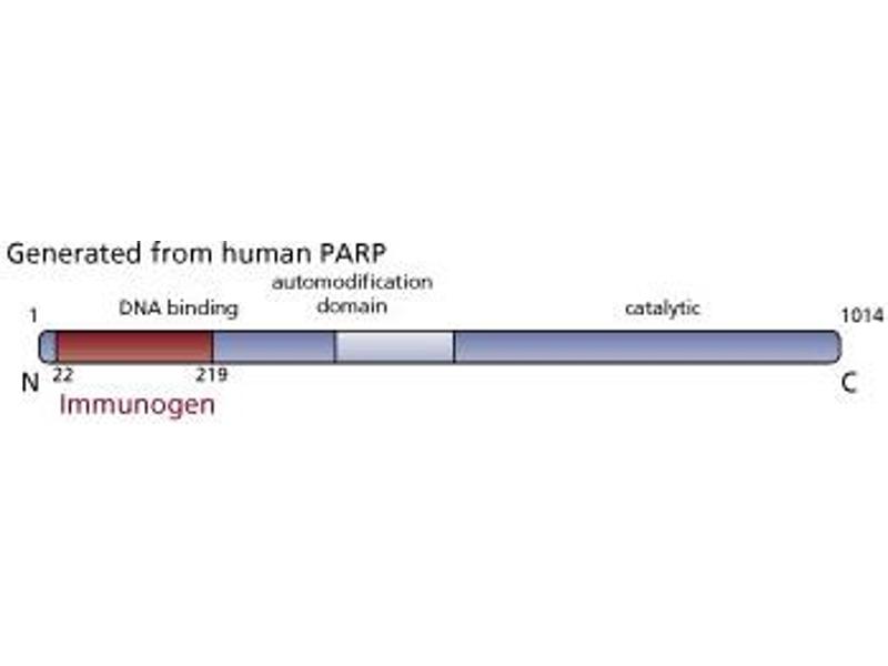 - Poly(ADP-ribose) polymerase (PARP) is a constitutively expressed, abundant nuclear protein. It has been referred to as a molecular nick sensor due to its recognition of, and catalytic activation by, single or double strand DNA breaks. The most critical ad extensively studied role of PARP is its participation in DNA base excision repair. Following binding to damaged DNA, PARP uses NAD+ to synthesize branched polymers of poly(ADP-ribose) on nuclear target proteins, including itself. Such modification of PARP increases its negative charge and results in loss of interactionwith DNA due to electrostatic repulsion. This opens the damaged DNA to DNA repair proteins. The poly(ADP-ribose) molecule is quickly degraded by poly (ADP-ribose) glycohydrolase that is found in association with PARP. PARP contains N-terminal DNA-binding domain (DBD), a central automodification domain that accepts poly (ADP-ribose), and a C-terminal catalytic domain. PARP is one of the earliest proteins targeted by caspase-3 during apoptosis. Although this protein is central to DNA repair, it has additional DNA-related functions that remain to be investigated. This antibody is routinely tested by western blot analysis.