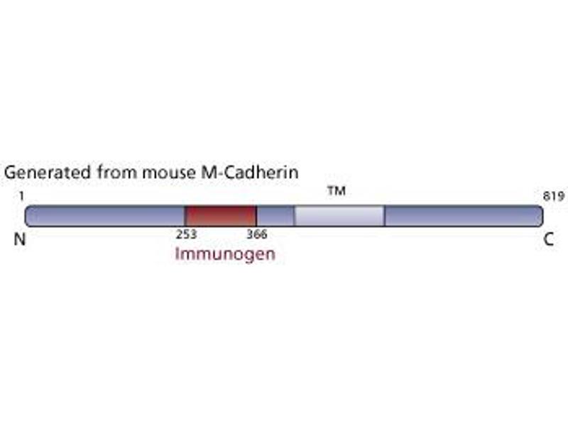 Cadherins are a family of transmembrane glycoproteins involved in the Ca2+-dependent cell-cell adhesion that occurs in many tissues. Members of this family include P-Cadherin, E-Cadherin (uvomorulin), N-Cadherin, R-Cadherin, Cadherin-5, L-CAM, and EP-Cadherin. These proteins are similar in their domain structure (45-74% amino acid conservation), Ca2+ and protease sensitivity, and molecular weight. However, cadherins have distinct tissue expression patterns and immunological reactivities. M (muscle)-Cadherin, another member of the Cadherin family, was discovered in myogenic mouse cells where it is present at low levels in myoblasts. It is expressed in prenatal and adult skeletal muscle and plays a role in skeletal muscle cell differentiation, particularly the fusion of myoblasts into myotubes. It is upregulated upon induction of myotube formation. M-Cadherin also forms complexes with the catenins in skeletal muscle cells, which then interact with the cytoskeleton. Therefore, it is thought that the M-Cadherin-cytoskeleton interaction may play a role in aligning myoblasts during fusion.