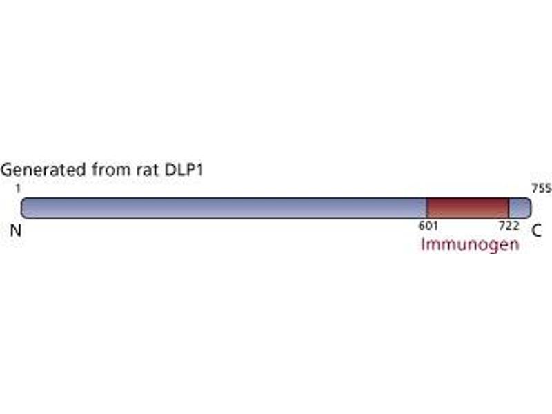 Dynamins, phosphoproteins with intrinsic GTPase activities, play an important role during early endocytosis. The GTPase activity is stimulated in vitro by microtubules, SH3 domain containing-proteins, and Protein Kinase (PKC)- mediated phosphorylation. Although highly related, dynamins are differentially expressed in an organism. For instance, dynamin I is found only in the nervous system, dynamin II is ubiquitously expressed, and dynamin III is located in lung, testis and brain. Due to four alternative splicing products for each of the dynamins, the dynamin family contains at least 12 different members. The Dynamin Like Protein-1 (DLP1) is a new member of the dynamin family of proteins. DLP1 (also known as DVLP) is widely expressed as two alternatively spliced products, each with different tissue expression patterns. The larger product is about 84 kDa and reportedly found only in the brain, whereas the 79 kDa product is ubiquitously expressed. Unlike dynamins I-III which co-localize with endocytotic vesicles, DLP1 is found aligned with microtubules and with the endoplasmic reticulum, suggesting a secretory function for this novel protein.